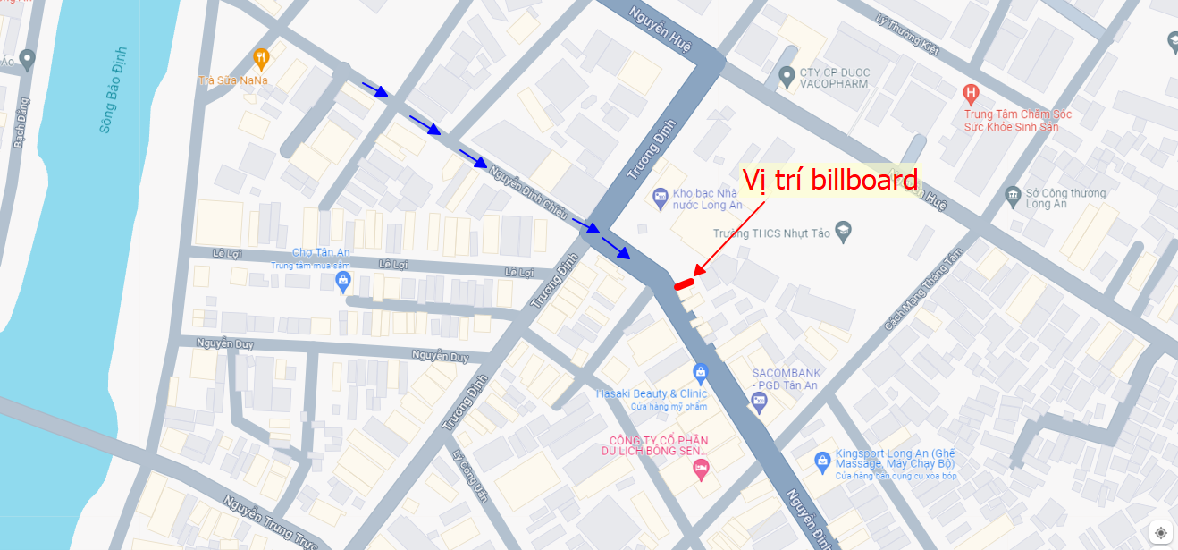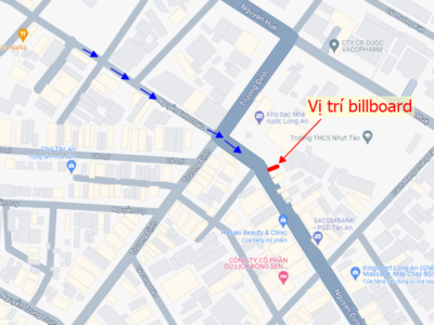 Bảng quảng cáo ngoài trời tọa lạc tại vị trí chiến lược ngay ngã tư Trương Định – Nguyễn Đình Chiểu. Đây là một trong những nút giao thông trọng điểm của thành phố Tân An. Cụ thể, bảng được đặt tại số 11 Nguyễn Đình Chiểu, phường 1, đảm bảo khả năng tiếp cận cao với lượng phương tiện và người qua lại đông đúc.